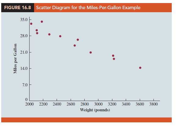 In showing how the general linear model can be used to model a variety of possible relationships between the independent variables and the dependent variable, we have focused attention on transformations involving one or more of the independent variables. Often it is worthwhile to consider transformations involving the dependent variable y. As an illustration of when we might want to transform the dependent variable, consider the data in Table 16.4, which shows the miles-per-gallon ratings and weights for 12 automobiles. The scatter diagram in Figure 16.8 indicates a negative linear relationship between these two variables. Therefore, we use a simple first-order model to relate the two variables. The output is shown in Figure 16.9; the resulting estimated regression equation is