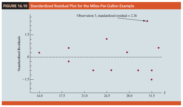 Looking at the residual plot in Figure 16.12, we see that the wedge-shaped pattern has now disappeared. Moreover, none of the observations is identified as having a large standardized residual. The model with the logarithm of miles per gallon as the dependent variable is statistically significant and provides an excellent fit to the observed data. Hence, we would recommend using the estimated regression equation