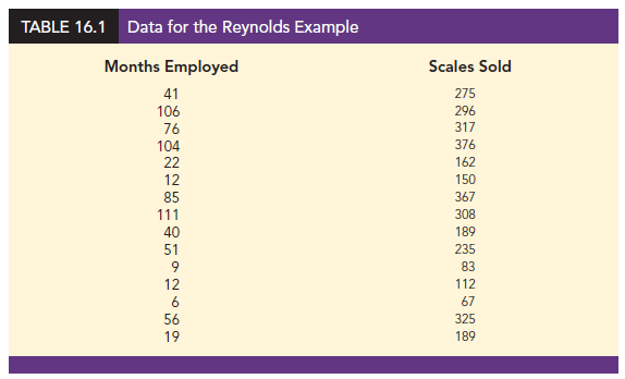 More complex types of relationships can be modeled with equation (16.1). To illustrate, let us consider the problem facing Reynolds, Inc., a manufacturer of industrial scales and laboratory equipment. Managers at Reynolds want to investigate the relationship between length of employment of their salespeople and the number of electronic laboratory scales sold. Table 16.1 gives the number of scales sold by 15 randomly selected salespeople for the most recent sales period and the number of months each salesperson has been employed by the firm. Figure 16.1 is the scatter diagram for these data. The scatter diagram indicates a possible curvilinear relationship between the length of time employed and the number of units sold. Before considering how to develop a curvilinear relationship for Reynolds, let us consider the output in Figure 16.2 corresponding to a simple first-order model; the estimated regression is