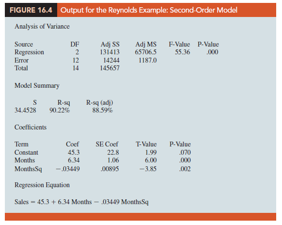 This model is called a second-order model with one predictor variable. To develop an estimated regression equation corresponding to this second-order model, the statistical software package we are using needs the original data in Table 16.1, as well as that data corresponding to adding a second independent variable that is the square of the number of months the employee has been with the firm. In Figure 16.4 we show the output corresponding to the second-order model; the estimated regression equation is