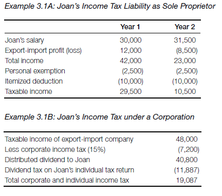 As illustrated in example 3.1B, a corporation’s income is subject to double taxation, first at the corporate level and then on the individual income tax return. Such incidences of double taxation are often reduced when deductions and other allowances are applied against taxable income. If earnings are left in the business, the tax rate may be lower than what would be paid by a sole proprietor. If the export-import business is incorporated as an S corporation, earnings are taxed only once, at the owner’s individual tax rate. Payment of Social Security tax is also avoided by withdrawing profits as dividends.