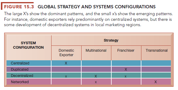 Information technology and improvements in global telecommunications are giving international firms more flexibility to shape their global strategies. The configuration, management, and development of systems tend to follow the global strategy chosen. Figure 15.3 depicts the typical arrangements. By systems we mean the full range of activities involved in building and operating information systems: conception and alignment with the strategic business plan, systems development, and ongoing operation and maintenance. For the sake of simplicity, we consider four types of systems configuration. Centralized systems are those in which systems development and operation occur totally at the domestic home base. Duplicated systems are those in which development occurs at the home base but operations are handed over to autonomous units in foreign locations. Decentralized systems are those in which each foreign unit designs its own unique solutions and systems. Networked systems are those in which systems development and operations occur in an integrated and coordinated fashion across all units.