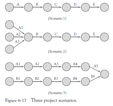 Assume that as project manager you are told that all of the tasks in the three network diagrams require 10 days to complete. What completion time would you calculate for each project? If you assume that the activity times are known with certainty, then all three projects would have the same duration of 50 days. If you find this result somewhat unsettling, you are in good company. Thinking about it intuitively, how can a simple project like scenario 1 with a single path and only five activities have the same duration as scenario 2 with three paths and seven activities, or with scenario 3 with two paths and ten activities?