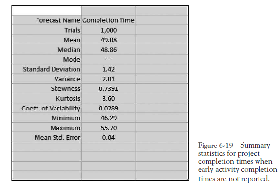 Figure 6-19 shows the statistical results of the simulation. A comparison of this figure with Table 5-7 clearly shows the impact of a failure to report early activity finishes. The mean completion time is increased by approximately 2.5 percent. The time for completion with a 95 percent probability (z = 1.645) increases by 4.6 percent.