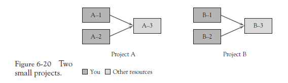 When project team members are assigned to multiple projects, they have to allocate their time across these projects or multitask. Multitasking involves switching from a task associated with one project to another task associated with a different project. To illustrate this, consider the two small projects shown in Figure 6-20. The completion of each of the projects’ three tasks requires you and one additional resource. Further, the completion of each task requires 5 days.