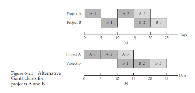 In Figures 6-21(a) and 6-21(b), Gantt charts have been developed for two alternative ways of completing the tasks. In Gantt chart 6-21(a), you switch between projects after each task is completed, while in Gantt chart 6-21(b) you complete all of your assigned tasks for Project A before beginning any work on Project B. In both of these cases the two projects are finished in 25 days; therefore, aren’t both sequences equally desirable? The answer is absolutely not. First, while it is true that in both cases Project B is finished by time 25, in the first sequence Project A finishes in 20 days, while in the second sequence Project A finishes 5 days earlier. Therefore, the sequence shown in the second Gantt chart is preferable because it results in Project A finishing 5 days earlier with no penalty to Project B.