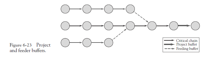 Based on this definition of the critical chain, there are two potential sources that can delay the completion of a project. One source of delay is in the tasks that make up the critical chain. The project buffer discussed earlier is used to protect against these delays (see Figure 6‑23). The second source of delay is in the tasks external to the critical chain. These tasks can also delay the completion of the project if delays in these “feeder” paths end up delaying one or more of the tasks on the critical chain. As shown in Figure 6‑23, safety time can be added to these paths as well to ensure that they do not delay tasks on the critical chain. The safety time added to chains other than the critical chain is called a feeding buffer since these paths often feed into or merge with the critical chain. Thus, the objective of feeding buffers is to ensure that noncritical chains are completed so that they do not delay tasks on the critical chain.