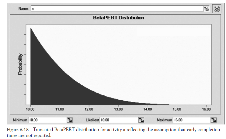 Once again, refer to Table 5-6 and consider the project described, solved, and then simulated in Chapter 5. When simulating this problem, we suggested that you should save the spreadsheet you created because we intended to use this problem in Chapter 6. We used BetaPERT distributions to reflect the uncertainty in activity duration times. The same distributions can be used, but in order to reflect Goldratt’s contention (and ours) that early completion times go unreported (and even if they were reported, the appropriate resources would probably not be available because managers avoid gathering resources until the last moment), we can truncate the distributions so that the lower bound is equal to the most likely time estimate. In effect, this means that no time below the most likely time can be reported. The required changes are easily made.