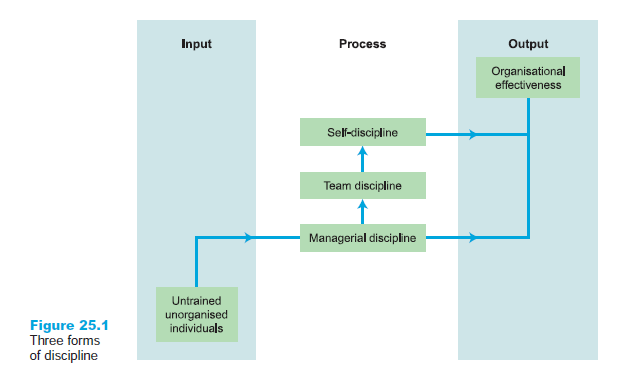 Discipline is, therefore, not only negative, producing punishment or prevention. It can also be a valuable quality for the individual who is subject to it, although the form of discipline depends not only on the individual employee but also on the task and the way it is organised. The development of self-discipline is easier in some jobs than others and many of the job redesign initiatives of recent years have been directed at providing scope for job holders to exercise self-discipline and find a degree of autonomy from managerial discipline. Figure 25.1 shows how the three forms are connected in a sequence or hierarchy, with employees finding one of three ways to achieve their contribution to organisational effectiveness. However, even the most accomplished solo performer has at some time been dependent on others for training and advice, and every team has its coach.