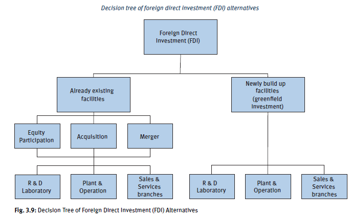 Another entry mode through an FDI, called a merger, is where two firms amalgamate their resources to form a new company. International mergers typically involve firms of similar size with different national origins. Mergers are sometimes preferred to an acquisition in order to minimize the mental reservations of the national governments that may be involved, depending on the strategic importance to the local economy (Grant 2013). Figure 3.9 provides an overview of FDI alternatives.
