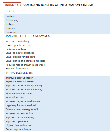 Table 14.3 lists some of the more common costs and benefits of systems. Tangible benefits can be quantified and assigned a monetary value. Intangible benefits, such as more efficient customer service or enhanced decision making, cannot be immediately quantified but may lead to quantifiable gains in the long run. Transaction and clerical systems that displace labor and save space always produce more measurable, tangible benefits than management information systems, decision-support systems, and computer-supported collaborative work systems (see Chapter 2 and Chapter 12).