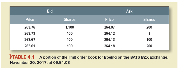 Table 4.1 shows a portion of the limit order book for Boeing from the BATS Exchange, one of the largest electronic markets. The bid prices on the left are the prices (and number of shares) at which investors are currently willing to buy. The ask prices on the right are those at which investors are prepared to sell. The prices are arranged from best to worst, so the highest bids and lowest asks are at the top of the list. The broker might electronically enter Ms. Jones’s market order to sell 100 shares on the BATS Exchange, where it would be matched with the best offer to buy, which at that moment was $263.76 a share. A market order to buy would be matched with the best ask price, $264.07. The bid-ask spread at that moment was, therefore, 31 cents per share.