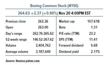 Boeing’s closing price on November 20, 2017, was $264.63, up $2.37, or .90% from the previous day’s close. Boeing had 595.58 million shares outstanding, so its market cap (shorthand for market capitalization) was 595.58 X $264.63 = $157.61 billion.