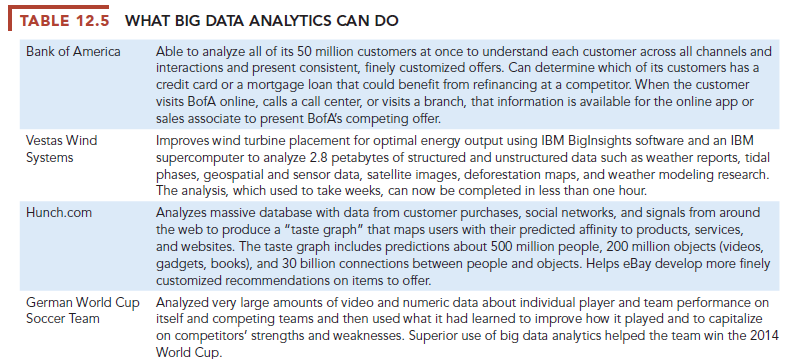 Predictive analytics are starting to use big data from both private and public sectors, including data from social media, customer transactions, and output from sensors and machines. In e-commerce, many online retailers have capabilities for making personalized online product recommendations to their website visitors to help stimulate purchases and guide their decisions about what merchandise to stock. However, most of these product recommendations have been based on the behaviors of similar groups of customers, such as those with incomes under $50,000 or whose ages are between 18 and 25 years. Now some retailers are starting to analyze the tremendous quantities of online and in-store customer data they collect along with social media data to make these recommendations more individualized. These efforts are translating into higher customer spending and customer retention rates. Table 12.5 provides examples of companies using big data analytics.