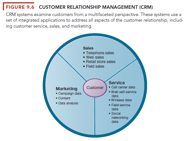 This is where customer relationship management systems help. Customer relationship management (CRM) systems, which we introduced in Chapter 2, capture and integrate customer data from all over the organization, consolidate the data, analyze the data, and then distribute the results to various systems and customer touch points across the enterprise. A touch point (also known as a contact point) is a method of interaction with the customer, such as telephone, email, customer service desk, conventional mail, Facebook, Twitter, website, wireless device, or retail store. Well-designed CRM systems provide a single enterprise view of customers that is useful for improving both sales and customer service (see Figure 9.6.)