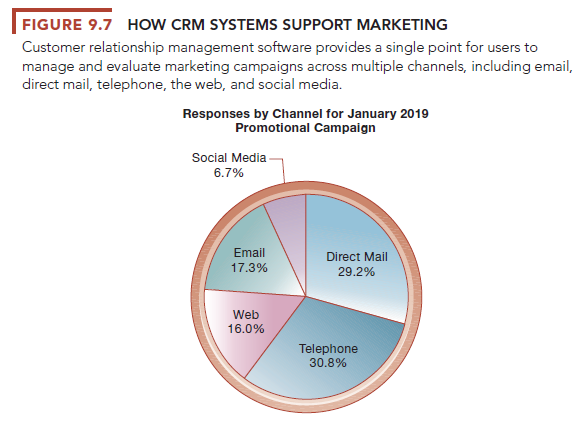 CRM systems support direct-marketing campaigns by providing capabilities for capturing prospect and customer data, for providing product and service information, for qualifying leads for targeted marketing, and for scheduling and tracking direct-marketing mailings or email (see Figure 9.7). Marketing modules also include tools for analyzing marketing and customer data, identifying profitable and unprofitable customers, designing products and services to satisfy specific customer needs and interests, and identifying opportunities for cross-selling.