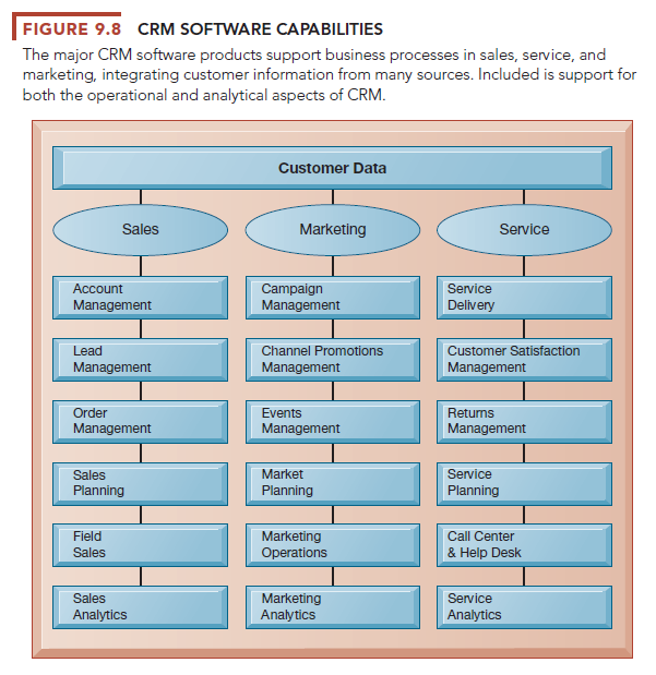 Figure 9.8 illustrates the most important capabilities for sales, service, and marketing processes found in major CRM software products. Like enterprise software, this software is business-process driven, incorporating hundreds of business processes thought to represent best practices in each of these areas. To achieve maximum benefit, companies need to revise and model their business processes to conform to the best-practice business processes in the CRM software.