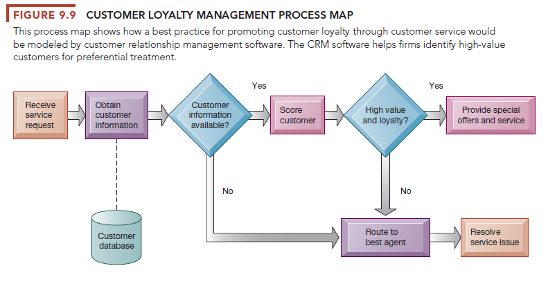 Figure 9.9 illustrates how a best practice for increasing customer loyalty through customer service might be modeled by CRM software. Directly servicing customers provides firms with opportunities to increase customer retention by singling out profitable long-term customers for preferential treatment. CRM software can assign each customer a score based on that person’s value and loyalty to the company and provide that information to help call centers route each customer’s service request to agents who can best handle that customer’s needs. The system would automatically provide the service agent with a detailed profile of that customer that includes his or her score for value and loyalty. The service agent would use this information to present special offers or additional services to the customer to encourage the customer to keep transacting business with the company. You will find more information on other best-practice business processes in CRM systems in our Learning Tracks.
