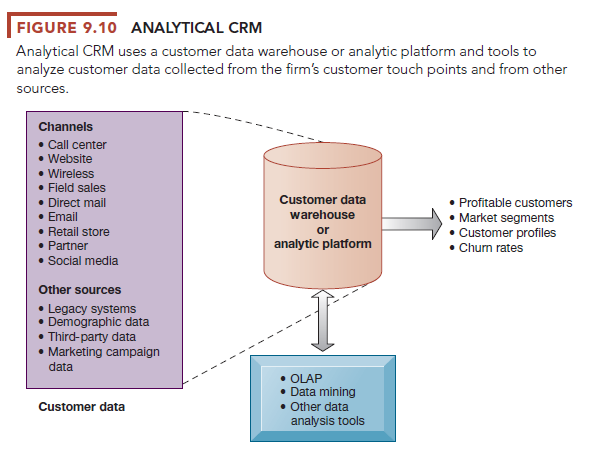 Analytical CRM applications are based on data from operational CRM systems, customer touch points, and other sources that have been organized in data warehouses or analytic platforms for use in online analytical processing (OLAP), data mining, and other data analysis techniques (see Chapter 6). Customer data collected by the organization might be combined with data from other sources, such as customer lists for direct-marketing campaigns purchased from other companies or demographic data. Such data are analyzed to identify buying patterns, to create segments for targeted marketing, and to pinpoint profitable and unprofitable customers (see Figure 9.10).
