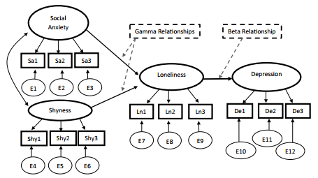 Let’s look at an example of a structural model. This simple model tests how an individu- al’s levels of Social Anxiety and Shyness influence Loneliness perceptions. These Loneliness perceptions will then directly influence evaluations of Depression. Let’s try to calculate the degrees of freedom.You have 12 indicators, 4 constructs, 2 gamma relationships, and 1 beta relationship.
