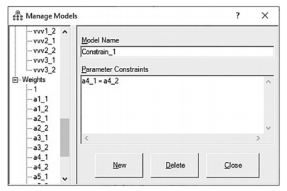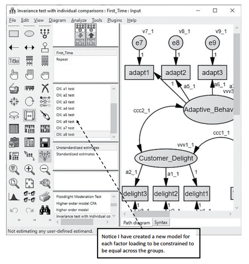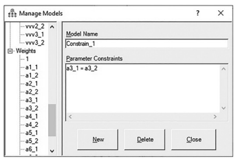 Let’s say in our example, we think there is an invariance problem with the PositiveWord of Mouth construct. The first thing I want to do is create a new constrained model in AMOS that will allow me to constrain only one factor loading at a time. First, let’s go to the models window in AMOS and double click on the “Unconstrained” model.This will bring up the “Manage Models” pop-up window. I want to select the “New” button at the bottom to form a new model. A new window will pop up where you need to label the model. I like to call the new model simply “Constrain 1”.The first indi- cator inWord of Mouth (WOM1) is constrained to 1 to set the metric, so this item will not help us. The second indicator (WOM2) is labeled a3_1 (or a3_2 for second group). I want to constrain just this indicator to be equal across the groups and to see if there is a significant chi-square difference just for this one factor loading. In the pop-up window, I denote that a3_1 = a3_2. (If you double click on the variables on the left-hand side, it will pull the variable over to the parameter constraint field without having to type it in.) After constraining this one factor loading, I hit the “Close” button and then run the analysis again
