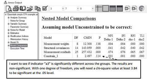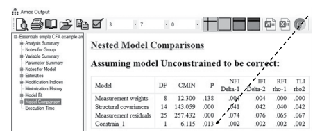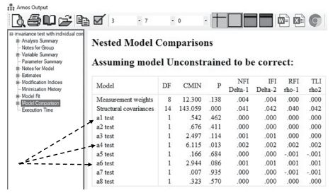 We can see that constraining just “a4” across the groups did find a significant difference (p-value of 0.013).You can now run a partial metric invariance test where you are constrain- ing the factor loadings to be equal across the groups except for WOM3 (a4), which is now not constrained across the groups. If you are still not achieving a non-significant invariance test, you will need to see if other individual factor loadings are significantly different across the groups.You may have to perform this individual constraint test for multiple constructs if you are having a problem zeroing in on where the invariance problem lies. As I said, this can be time consuming and laborious, but it is necessary to achieve partial metric invariance.