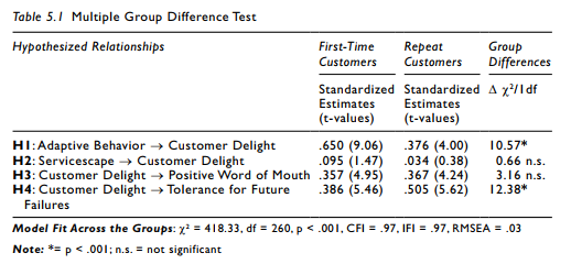 Here is a way you can present your results in a table format that will be easy for the reader to understand. In a two group analysis, you need to present the relationship strength (standard- ized coefficient) and t-values for each relationship.You also need to show the significance of the comparison across groups.This can be done by presenting the chi-square differences across both groups when that specific relationship is constrained.