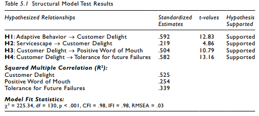 With the structural model, it is a good idea to present standardized regression weights, t-values, model fit statistics, and R2 values. I like to present R2 values of the dependent con- structs so the reader can see how much of the variance is being explained with my independ- ent variables. I also like to state if my hypotheses were supported or not. I feel like there is no need to present the measurement indicators again because you should have presented this with a confirmatory factor analysis prior to performing the structural analysis. Ultimately, you want to say a lot in a little amount of space. Presenting your results in a table should be done in a manner where the reader can see all the necessary information to determine the final results of your SEM test. This is not the only way to present structural results, but it is a good template.