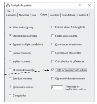 After making this selection, cancel out of the window and run the analysis. In the out-put, you need to select the option titled “Observations farthest from the centroid”. The results will give a Mahalanobis d-square result.This statistic represents the squared distance from the centroid of a data set. The bigger the distance, the farther the item is from the mean distribution. AMOS also presents two additional statistics, p1 and p2. The p1 column shows the probability of any observation exceeding the squared Mahalanobis distance of that observation. The p2 column shows the probability that the largest squared distance of any observation would exceed the Mahalanobis distance computed. Arbuckle (2017) provides a heuristic for determining which observations may be outliers stating that small numbers in the p1 column are to be expected. Small numbers in the p2 column, on the other hand, indicate observations that are improbably far from the centroid under the hypothesis of normality. If you have p1 and p2 values that are less than .001, these are cases denoted as outliers. Figure 5.40 shows an example of the output when I ran the outlier analysis for the full structural model.