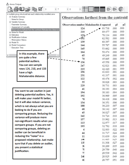 If your model fit is poor and the modification indices are providing no help, you might want to examine the multivariate outliers in your data set. A multivariate outlier is a collection of unusual or “out-of-the-norm” scores across multiple variables. Let’s go back to the full structural model example. If you go into the Analysis Properties function