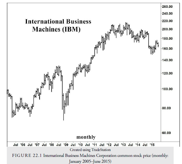 Looking at the monthly chart of IBM (see Figure 22.1) from 2005 through mid-2015, we see several periods of upward and downward trends and trading ranges. This is an ideal history to analyze and test because it includes the three possible trends in any market: up, down, and sideways. It also covers a period of more than nine years, roughly 2250 days, enough to give us plenty of signals.