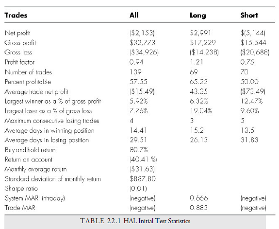 - Looking at the number of trades, this system generated 139 trades: 69 long trades and 70 short trades. This is a large enough number of trades for reliable statistics. Generally, at least 30–50 trades are required to test a system.