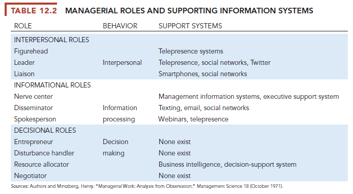 Table 12.2, based on Mintzberg’s role classifications, is one look at where systems can and cannot help managers. The table shows that information systems are now capable of supporting most, but not all, areas of managerial life.