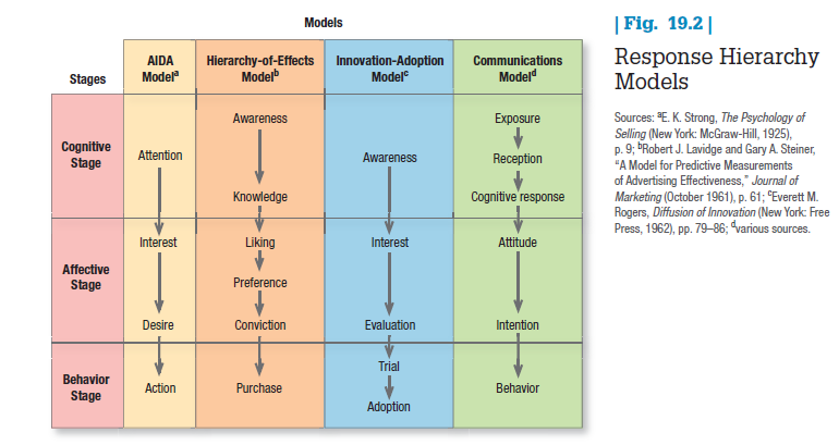 MICROMODEL OF CONSUMER RESPONSES Micromodels of marketing communications concentrate on consumers’ specific responses to communications.10 Figure 19.2 summarizes four classic response hierarchy models.