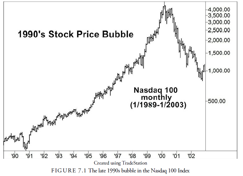 At times, emotional excess leads to extraordinary rises in prices (and sometimes to extraordinary declines, called crashes or panics). These periods of extraordinary price increases, whether in the stock market, gold, or tulip bulbs, are called bubbles. During a bubble, stock market returns are much higher than the mean, or average, return. Bubbles are part of that fat tail mentioned in Chapter 4, “The Technical Analysis Controversy.” Although bubbles occur infrequently, they occur considerably more often than would be expected under an ideal random walk model.