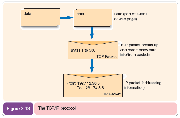 Once the Internet message is addressed, the postal analogy is not so apt since related information is not sent across the Internet in one large message. For reasons of efficiency, information sent across IP networks is broken up into separate parts called packets. The information within a packet is usually between 1 and 1,500 characters long. This helps to route information most efficiently and fairly with different packets sent by different people gaining equal priority. The transmission control protocol TCP performs the task of splitting up the original message into packets on dispatch and reassembling it on receipt. Combining TCP and IP, you can think of an addressed IP envelope containing a TCP envelope which in turn contains part of the original message that has been split into a packet (Figure 3.13).