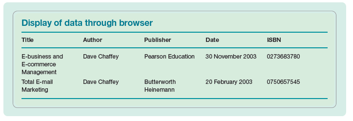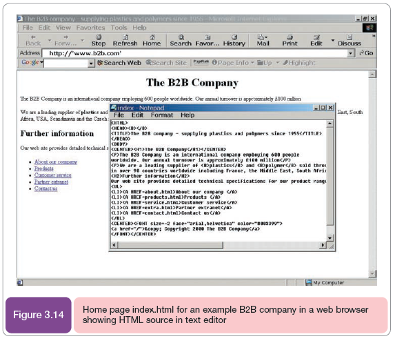 A brief example of HTML is given for a simplified home page for an example B2B company in Figure 3.14. The HTML code used to construct pages has codes or instruction tags such as <TITLE>. to indicate to the browser what is displayed. The <TITLE>. tag indicates what appears at the top of the web browser window. Each starting tag has a corresponding end tag usually marked by a ‘/’, for example, <B>plastics</B> to embolden ‘plastics’.