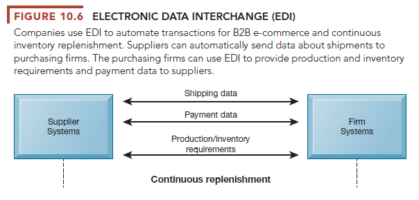 EDI originally automated the exchange of documents such as purchase orders, invoices, and shipping notices. Although many companies still use EDI for document automation, firms engaged in just-in-time inventory replenishment and continuous production use EDI as a system for continuous replenishment. Suppliers have online access to selected parts of the purchasing firm’s production and delivery schedules and automatically ship materials and goods to meet prespecified targets without intervention by firm purchasing agents (see Figure 10.6).