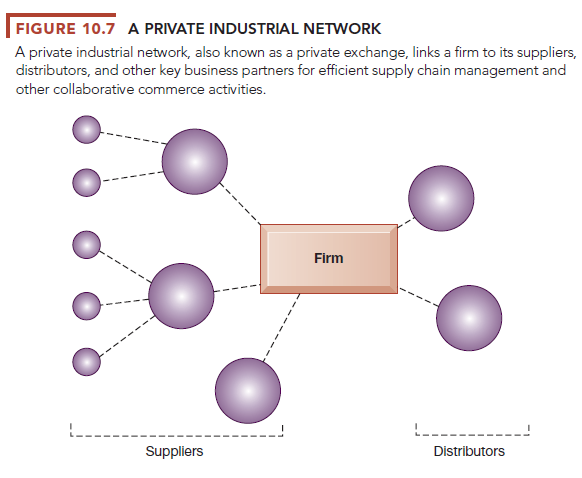 Private industrial networks typically consist of a large firm using a secure website to link to its suppliers and other key business partners (see Figure 10.7). The buyer owns the network, and it permits the firm and designated suppliers, distributors, and other business partners to share product design and development, marketing, production scheduling, inventory management, and unstructured communication, including graphics and email. Another term for a private industrial network is a private exchange.