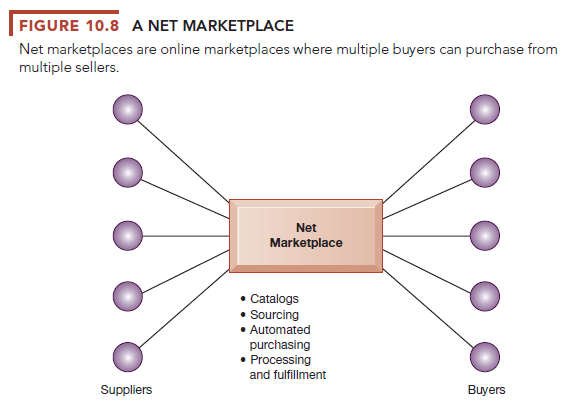 Net marketplaces, which are sometimes called e-hubs, provide a single, digital marketplace based on Internet technology for many buyers and sellers (see Figure 10.8). They are industry-owned or operate as independent intermediaries between buyers and sellers. Net marketplaces generate revenue from purchase and sale transactions and other services provided to clients. Participants in Net marketplaces can establish prices through online negotiations, auctions, or requests for quotations, or they can use fixed prices.