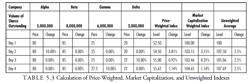 The Dow Jones averages are price-weighted averages. This means that the prices for each of the component stocks are added together, and the sum is divided by a divisor that has changed over the years to account for splits and stock dividends in each of the component stocks. To see how a price-weighted average is constructed, consider the four hypothetical stocks in Table 5.3. A price-weighted average for each trading day is calculated by simply adding the four prices and dividing by four. The problem with a price-weighted average is that a high-priced stock will have more influence on the average than a lower-priced stock. Note that between trading Day 1 and Day 2, the price of Alpha increased by 10%, while the price of the other three stocks remained constant; this led to a 3.8% increase in the value of the price-weighted index. On the following trading day, the price of Delta rose by 10% and the price of the other three stocks did not change. When the lower-priced Delta increased in value by 10%, the price-weighted index only changed by 0.9%. The price-weighted average does not represent the usual manner in which a portfolio is constructed. Investors rarely invest in an equal number of shares in each portfolio stock.