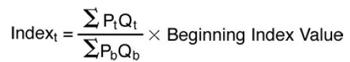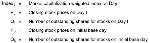 To compare the way this index construction differs from price weighting, refer to Table 5.3. To begin creating a market capitalization weighted index, an initial market value of all the included stocks is calculated. In our example, this would be accomplished by multiplying each stock’s price by the number of shares outstanding on Day 1. This gives a value of 1,270,000,000. This initial figure is the base and is assigned an index value, usually of 100. Then a new market value is calculated for all of the securities each trading day. This new value is compared with the initial base level to calculate a daily index value. The general formula for calculating the daily index level is