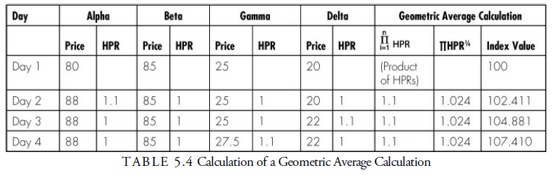 Several of the Value Line averages are equal weighted averages that are calculated using an arithmetic average of the percent changes. However, one of the Value Line averages, the Value Line Industrials Average, and the Financial Times Ordinary Share Index are equally weighted averages that are constructed in a slightly different manner. These two indices are computed using a geometric average of the holding period returns. Table 5.4 demonstrates the calculation of a geometric average for the four-stock portfolio example.