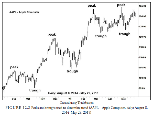 What is the simplest way to look at prices and determine the trend? The easiest is to look for peaks and troughs within a series of price oscillations. If the peaks tend to be higher than the earlier peaks, and the troughs tend to be higher than the previous troughs, the trend must be upward. As you see in Figure 12.2, it is that simple. If peaks and troughs are lower than previously, the trend must be downward. If the peaks and troughs are scattered, the trend is undeterminable, and if the peaks and troughs occur at the same relative levels, the trend must be a trading range.