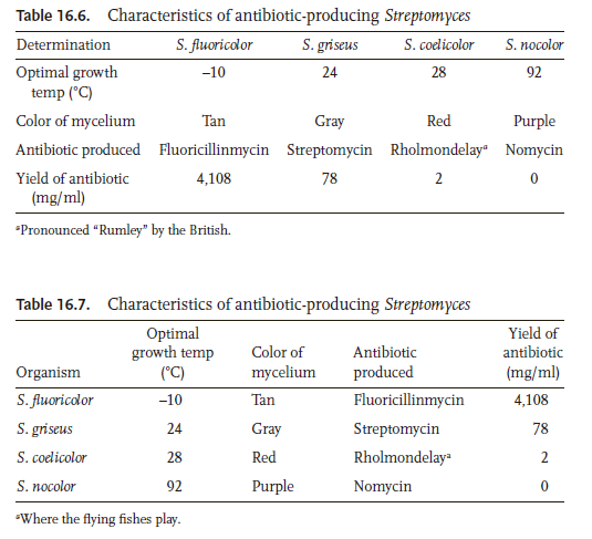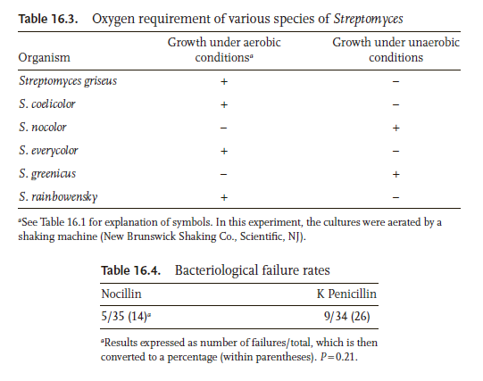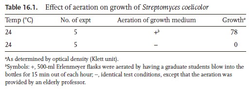Table 16.1 is faulty because two of the columns give standard conditions, not variables and not data. If temperature is a variable in the experiments, it can have its column. If all experiments were done at the same temperature, however, this single bit of information should be noted in the materials and methods section and perhaps as a footnote to the table, but not in a column in the table. The data presented in the table can be given in the text itself in a form that is readily comprehensible to the reader, without taking up space with a table. Very simply, these results would read: “Aeration of the growth medium was essential for the growth of Streptomyces coelicolor. At room temperature (24°C), no growth was evident in stationary (unaerated) cultures, whereas substantial growth (OD, 78 Klett units) occurred in shaken cultures.”