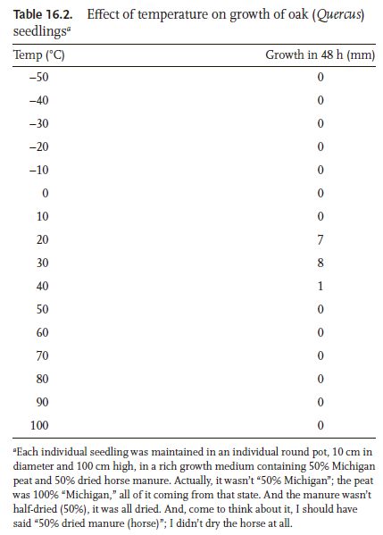 Table 16.2 has no columns of identical readings, and it looks like a good table. But is it? The independent variable column (temperature) looks reasonable enough, but the dependent variable column (growth) has a suspicious number of zeros. You should question any table with a large number of zeros (whatever the unit of measurement) or a large number of 100s when percentages are used. Table 16.2 is a useless table because all it tells us is that “The oak seedlings grew at temperatures between 20 and 40°C; no measurable growth occurred at temperatures below 20°C or above 40°C.”