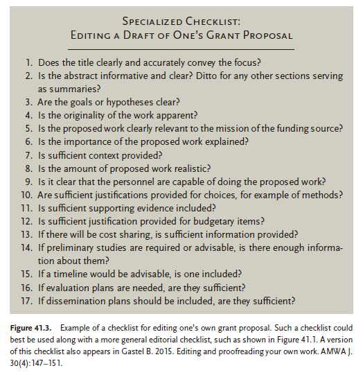One good strategy is to use both a core checklist on general aspects of writing and a specialized checklist geared to the type of document that you have drafted. Figure 41.1 is an example of a core checklist. Figures 41.2 and 41.3 are examples, respectively, of specialized checklists for a scientific paper and for a grant proposal. Consider using these checklists or modifying them to suit your needs. Also consider obtaining or developing such checklists for other types of documents. Of course, if your target journal or other intended recipient provides a checklist, be sure to consult it.