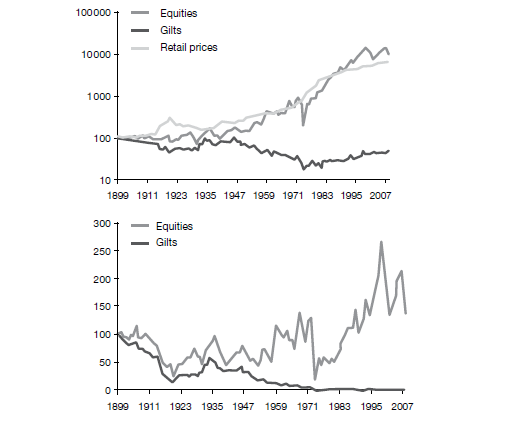 Another criterion might be the sort of reward you would need for the admitted risks of investing in shares. Both sides of that equation are subjective – risks vary with the timescale, the choice of investments and the range of holdings; rewards need to be compared with the return from alternative uses of the money such as putting the cash on deposit, into gilts, or into other investments such as property, art and so on. Returns on equities (another term for shares) are usually several percentage points higher than on gilts, which in turn are several points above deposit accounts, but what the real return will be in the future is only an extrapolation – history shows that both absolute and relative values change.