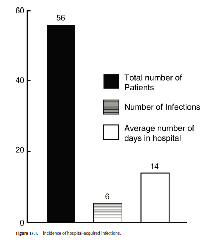 An example of an unneeded bar graph is shown in Fig. 17.1. This figure could be replaced by one sentence in the text: “Among the test group of 56 patients who were hospitalized for an average of 14 days, 6 acquired infections.”