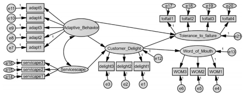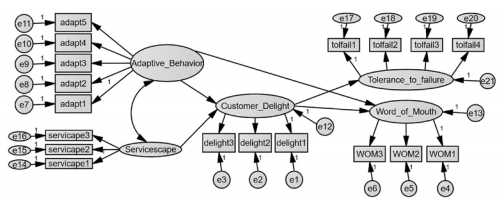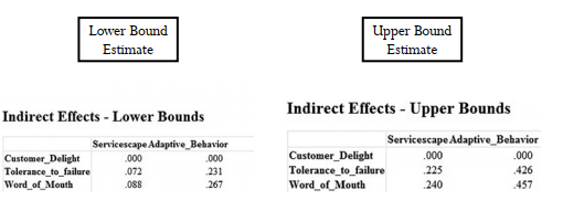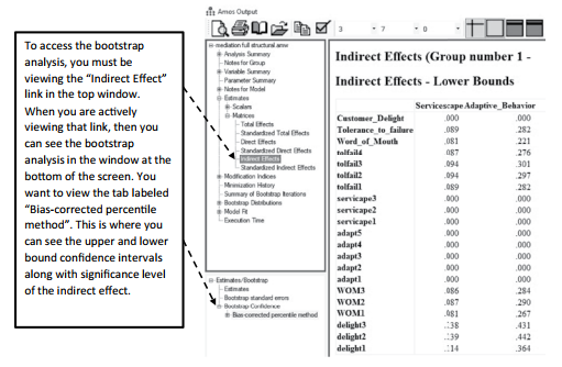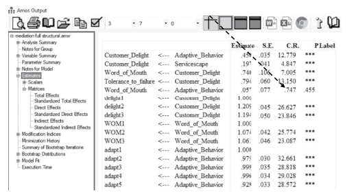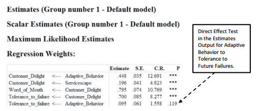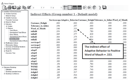 Thus, we have a significant indirect effect and non-significant direct effect, meaning that Cus- tomer Delight fully mediates the relationship of Adaptive Behavior to Tolerance to Future Fail- ures. If you have only one potential mediator in your model, AMOS will give you all possible indirect effects, which is a nice function and can save you time especially if you have a large number of independent and dependent variables.
